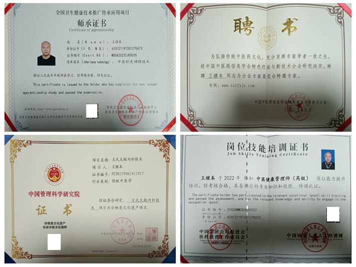 2018年3月取得中医针灸师三级(高级)证书,2019年7月被民间中医学术委员会评委“郎中大师奖牌”;2022年3月取得中医健康管理师(高级)职称;2023年3月王继本大师被中国中医药信息学会特色疗法与新技术分会特聘为“分会专家委员会特邀专家”;2023年6月被中国管理科学研究院评为“非物质文化遗产传承人”,其中“王氏太极内针技术项目”被中国管理科学研究院评为非物质文化遗产项目。